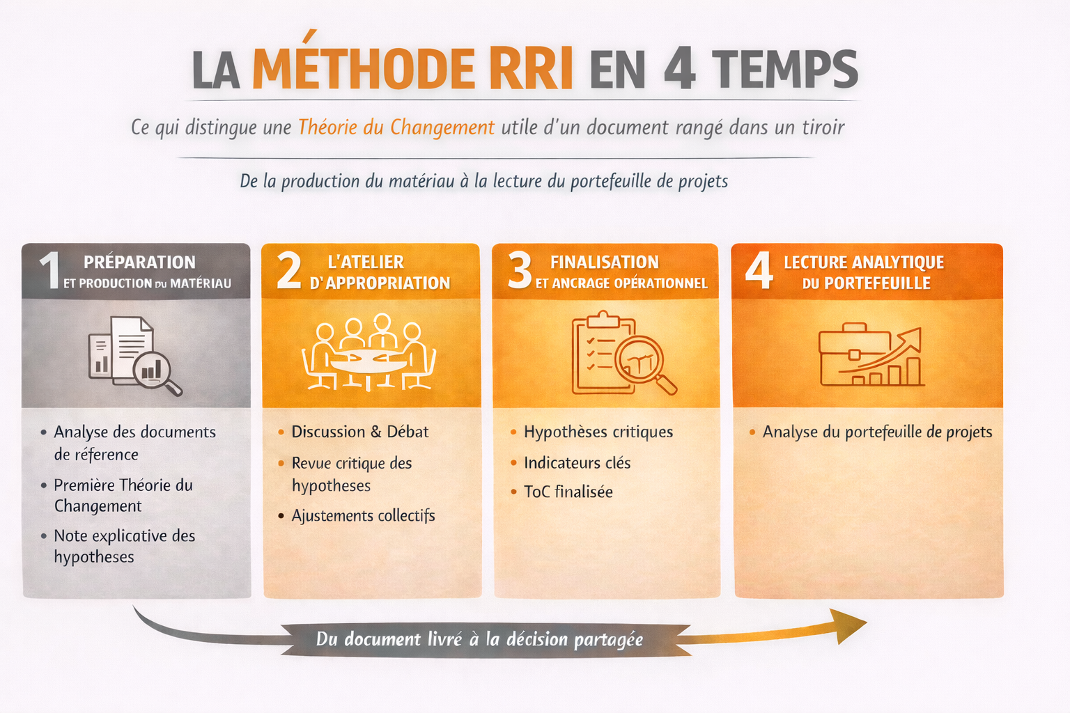 Avoir une Théorie du Changement construite au niveau de la fondation elle-même, c'est disposer d'un raisonnement documenté pour répondre à cette question devant son conseil, ses donateurs, et pour soi-même.